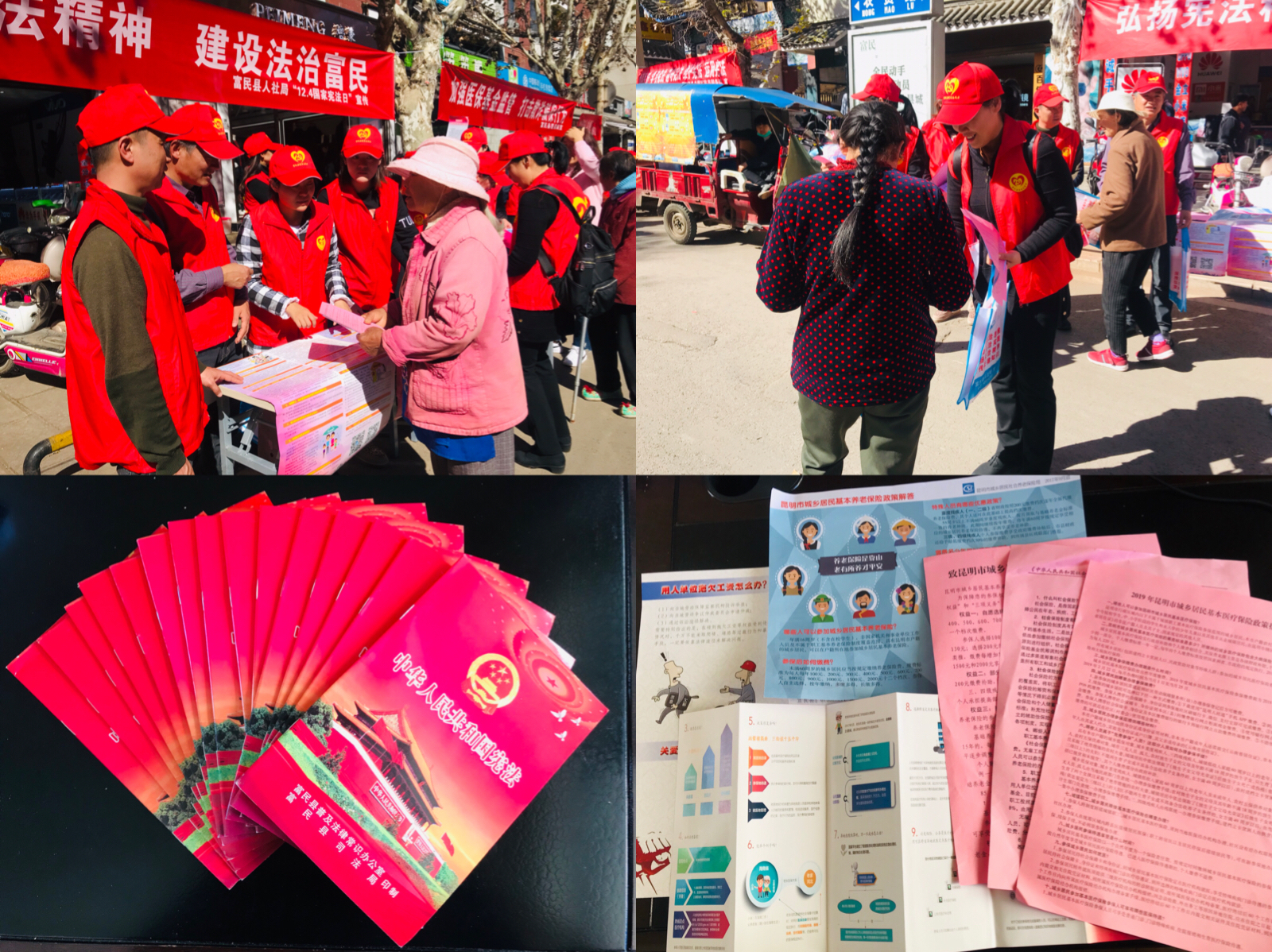 宣传活动围绕主题,结合人社工作实际,通过悬挂横幅标语、发放宣传资料、面对面咨询讲解等多种形式展开,重点向过往群众宣传《中华人民共和国宪法》。并结合工作职能,大力宣传社会保障和劳动就业法规、政策。共发放宪法读本100本,《中华人民共和国社会保险法》 “2019年昆明市城乡居民基本医疗保险政策指南”、“劳动监察宣传资料”“致昆明市城乡居民基本养老保险参保人公开信”“异地就医结算”等宣传资料500余份,环保宣传袋100个,解答政策咨询270余人次,实现活动宣传形式多样化,达到宣传普及效果。