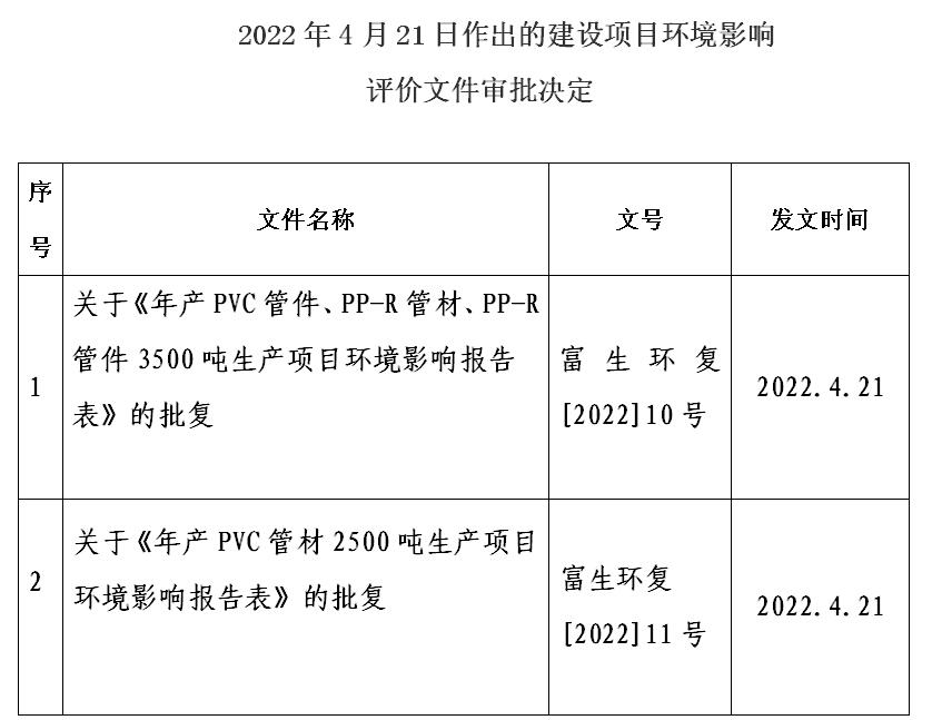 关于《年产PVC管件、PP-R管材、PP-R管件3500吨生产项目环境影响报告表》的批复 富生环复[2022]10号(盖章)