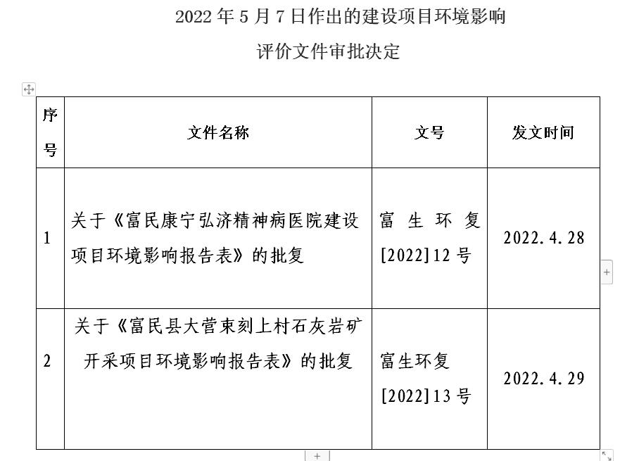 昆明市生态环境局富民分局关于2022年5月7日作出的建设项目环境影响评价文件审批决定的公告。