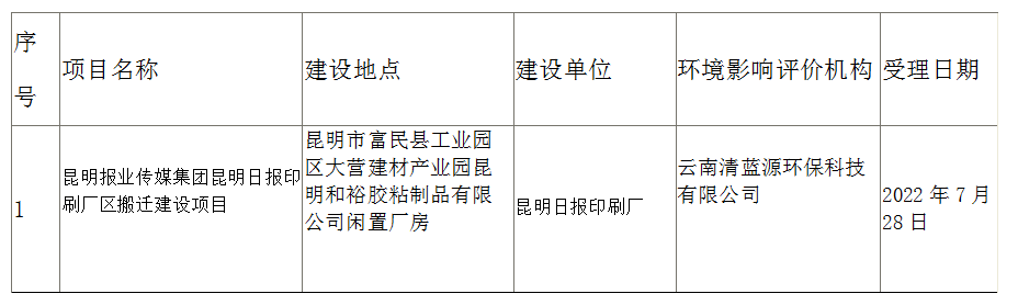 昆明市生态环境局富民分局关于昆明报业传媒集团昆明日报印刷厂区搬迁建设项目环境影响评价文件受理情况的公示