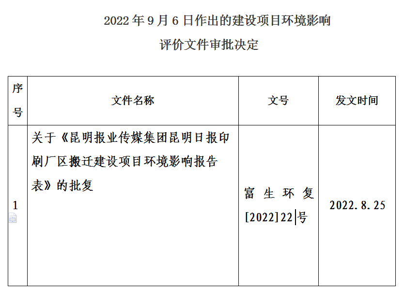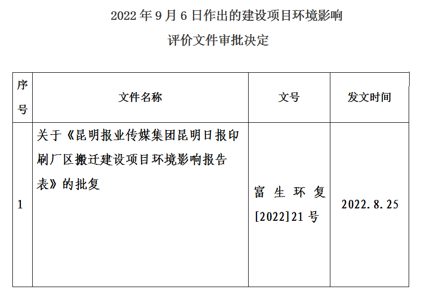 昆明市生态环境局富民分局关于2022年9月6日作出的建设项目环境影响评价文件审批决定的公告。