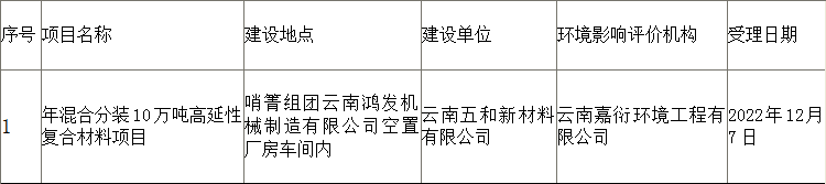 昆明市生态环境局富民分局关于年混合分装10万吨高延性复合材料项目环境影响评价文件受理情况的公示