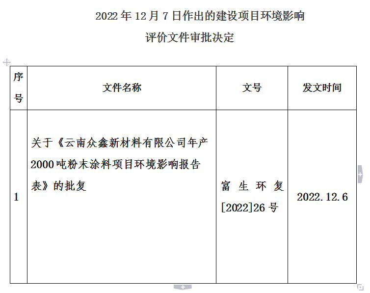 昆明市生态环境局富民分局关于2022年12月7日作出的建设项目环境影响评价文件审批决定的公告。
