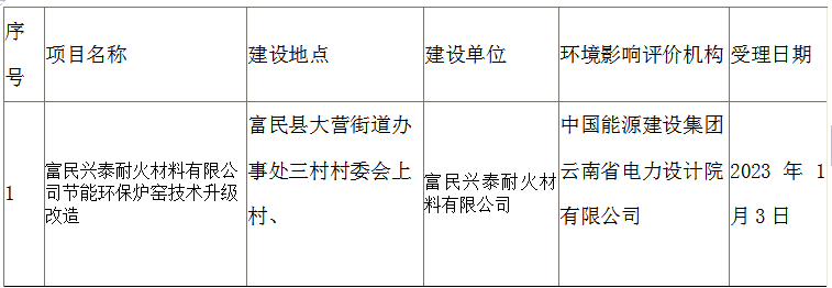 昆明市生态环境局富民分局关于富民兴泰耐火材料有限公司节能环保炉窑技术升级改造环境影响评价文件受理情况的公示