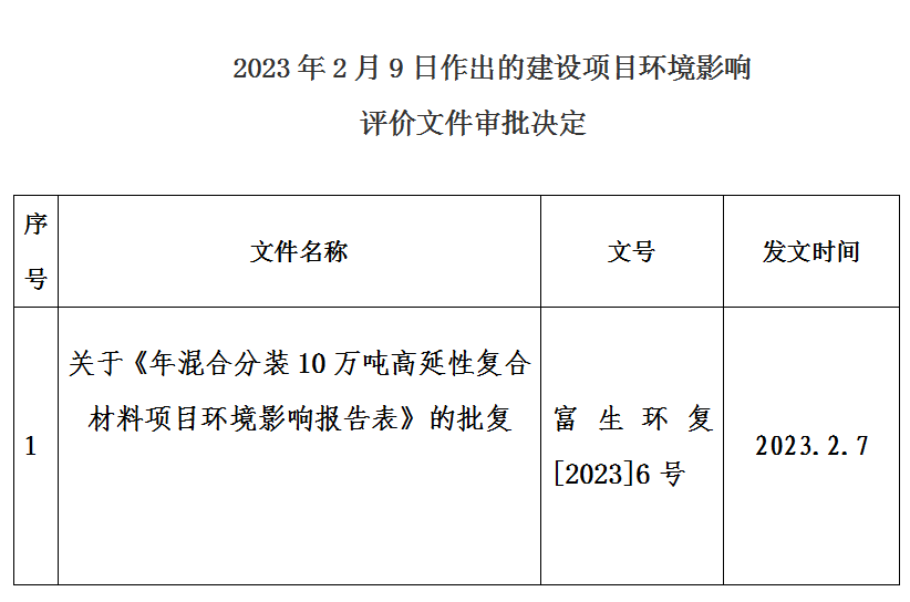 关于《年混合分装10万吨高延性复合材料项目环境影响报告表》的批复 富生环复[2023]6号(盖章)