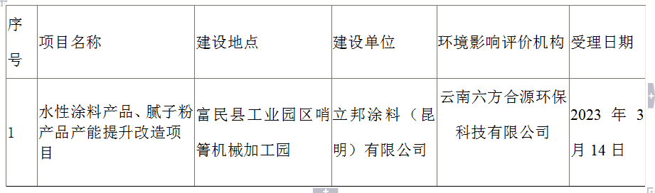 昆明市生态环境局富民分局关于水性涂料产品、腻子粉产品产能提升改造项目环境影响评价文件受理情况的公示