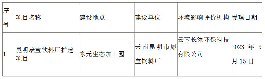 昆明市生态环境局富民分局关于昆明康宝饮料厂扩建项目境影响评价文件受理情况的公示