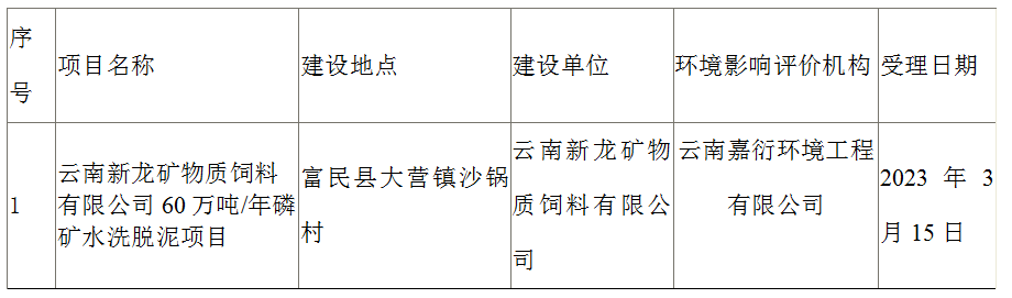 昆明市生态环境局富民分局关于云南新龙矿物质饲料有限公司60万吨/年磷矿水洗脱泥项目环境影响评价文件受理情况的公示