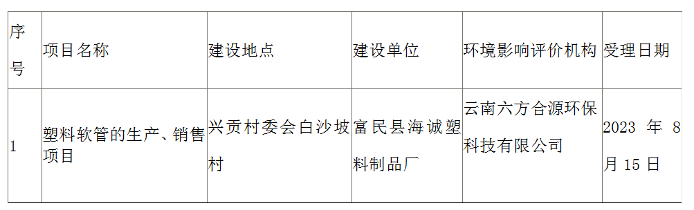 昆明市生态环境局富民分局关于塑料软管的生产、销售项目环境影响评价文件受理情况的公示