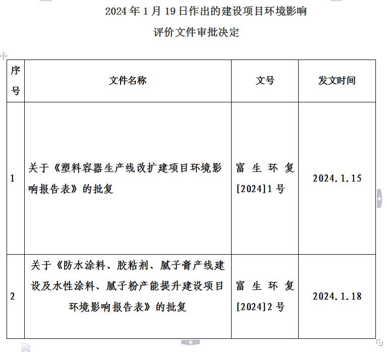 关于《防水涂料、胶粘剂、腻子膏产线建设及水性涂料、腻子粉产能提升建设项目环境影响报告表》的批复 富生环复[2024]2号(盖章)