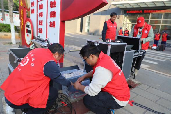 志愿者们早早来到活动现场,仔细检查各个设备,确保每一件设备组装都井然有序、状态良好。所有志愿者不怕脏不怕累,积极投入到搬运音响和舞台器材当中。