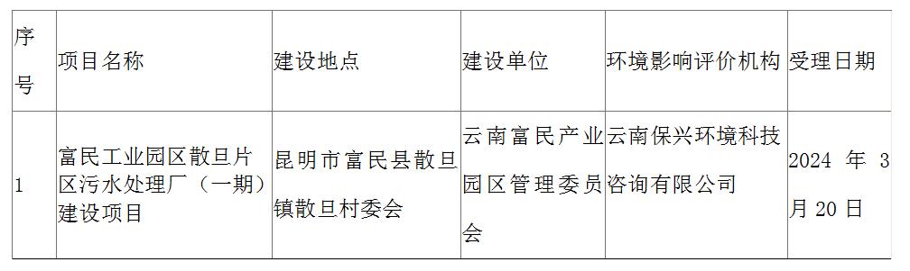 昆明市生态环境局富民分局关于富民工业园区散旦片区污水处理厂(一期)建设项目环境影响评价文件受理情况的公示