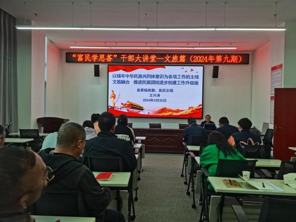 近日,“富民学思荟”干部大讲堂—文旅篇2024年第九期开讲,本期讲座邀请县委统战部副部长、县民宗局局长王兴泽同志主讲,县文旅局全体干部职工参加学习。
