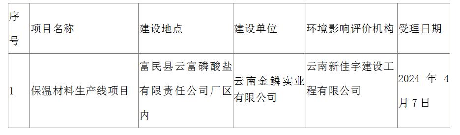 昆明市生态环境局富民分局关于保温材料生产线项目环境影响评价文件受理情况的公示