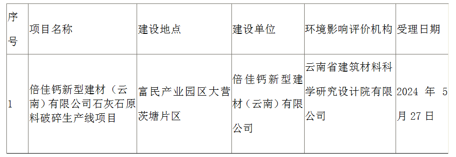 昆明市生态环境局富民分局关于倍佳钙新型建材(云南)有限公司石灰石原料破碎生产线项目环境影响评价文件受理情况的公示