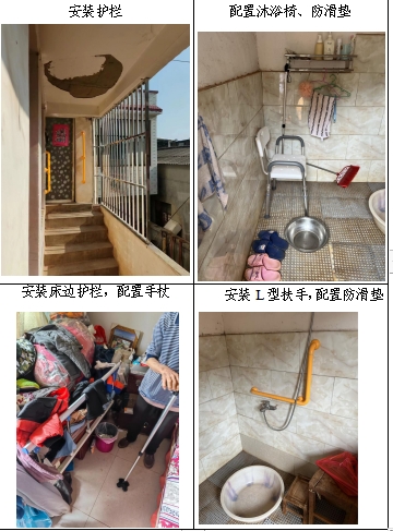 项目主要内容:聚焦高龄、失能、留守、空巢、残疾等特殊老年人家庭,围绕“生活空间安全、室内行走便利、辅助器具适配”三个方面功能,积极组织开展老年人居家适老化需求评估,根据农村地区群众生活环境特点制定“一户一策”“一户一案”改造方案,为老年人提供防坠、防滑设施安装等改造服务,配置沐浴椅、手杖、防走失装置等辅具。
