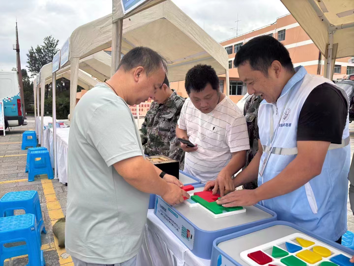 在展示环节,富民县科普队通过悬挂布标、发放宣传资料、科普展品互动等形式,向安宁市市民及其他参会单位展示了富民县近年来在科普宣传、科技创新、青少年科普教育等方面取得的成绩。活动现场,安宁市民特别是广大青少年与科普大篷车展品来了一场零距离的“约会”,四足机器人展示区围满了想要亲密接触的少年儿童,“保尔加里正方形、多彩的拼块、八仙过海、不同的颜色、珠子塔、独立钻石棋”6套思维科普展品让安宁市民们通过细致观察,亲自动手体验,在实践中锻炼思维,在“玩乐”中体验科技带来的乐趣。