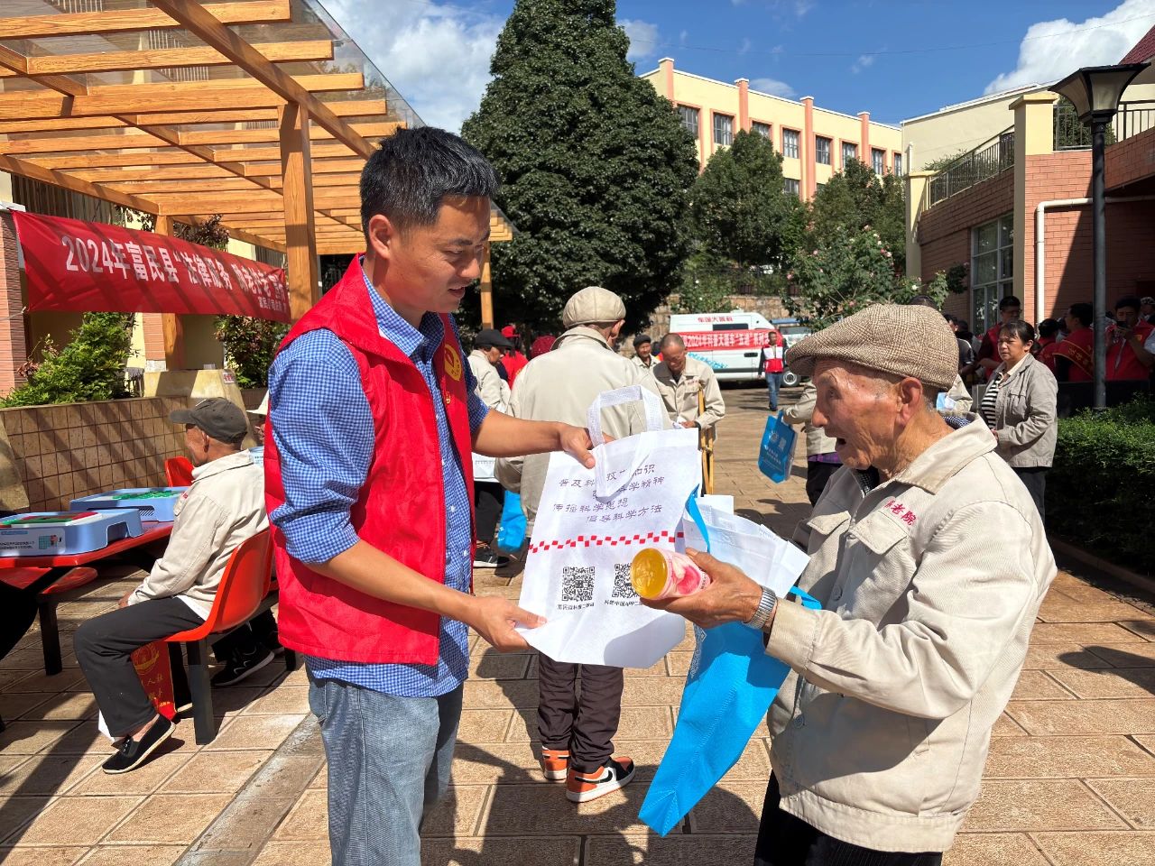 菊花吐蕊,桂花含香,岁岁重阳,今又重阳。为大力弘扬中华民族尊老爱幼的传统美德,进一步倡导敬老、爱老、助老的新风尚,积极履行社会责任,不断深化“我为群众办实事”实践活动。10月11日县红十字科协联合支部党员志愿者们走进富民县中心敬老院开展“重阳送温暖 银龄科普行”主题党日活动,为老人送温暖、办实事、做好事,同时为老人们送去节日的问候和真挚的祝福。