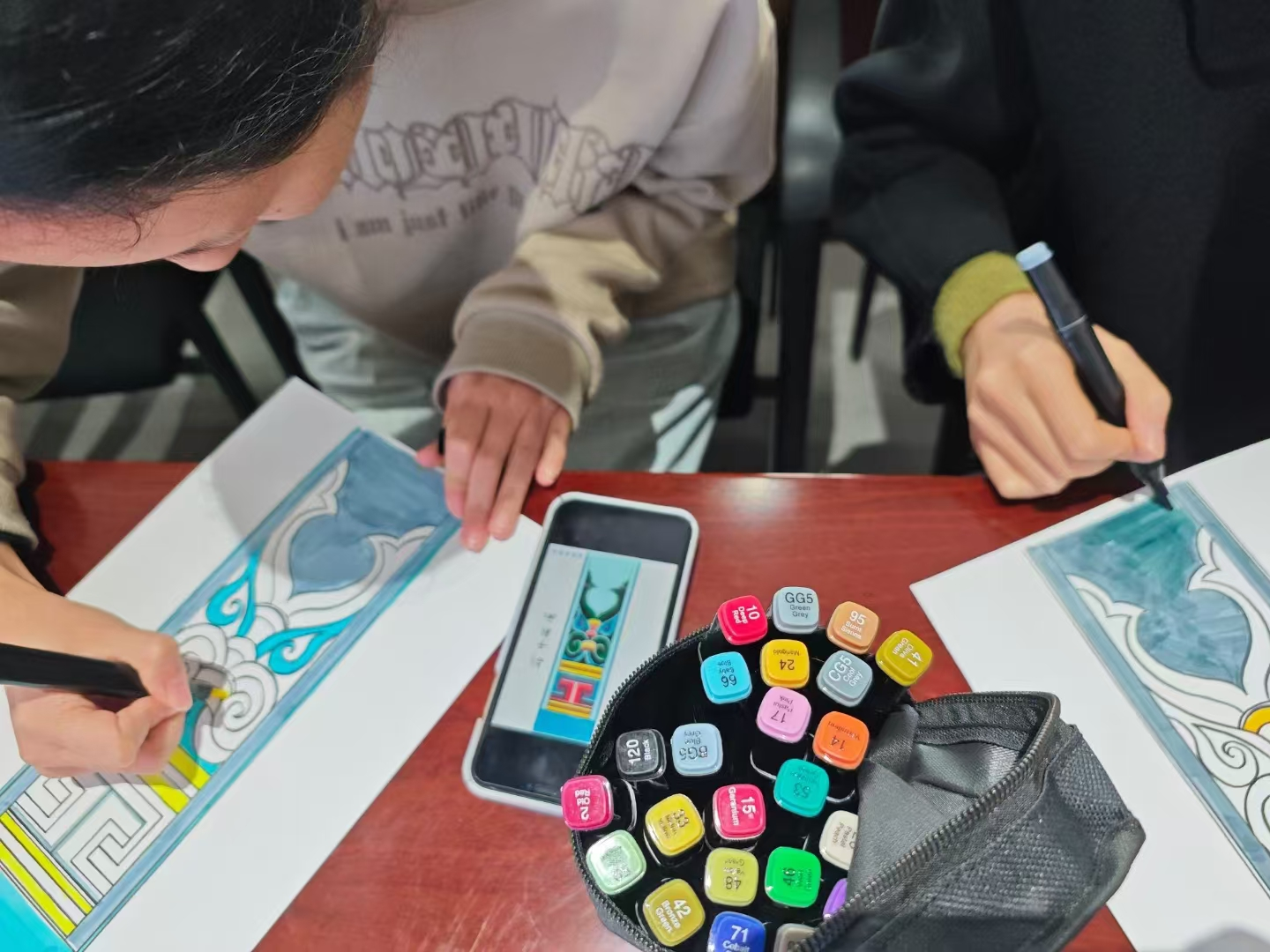 第二阶段对昆明地方彩画--“昆明古建筑彩画”绘制体验环节。在授课老师和科普辅导员指导下,参会人员纷纷拿起画笔,兴致盎然的体验古建筑彩画,运用古建筑彩画绘制技法,对照古建筑彩画样稿,聚精会神地给古建筑彩画谱子线稿填色。在绘制过程中,大家全神贯注,耐心细致,一笔一划都饱含着对传统文化的尊重和热爱。