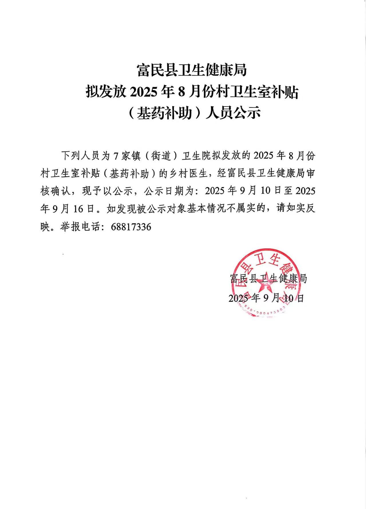 富民县卫生健康局拟发放2025年8月份村卫生室补贴(基药补助)人员名单