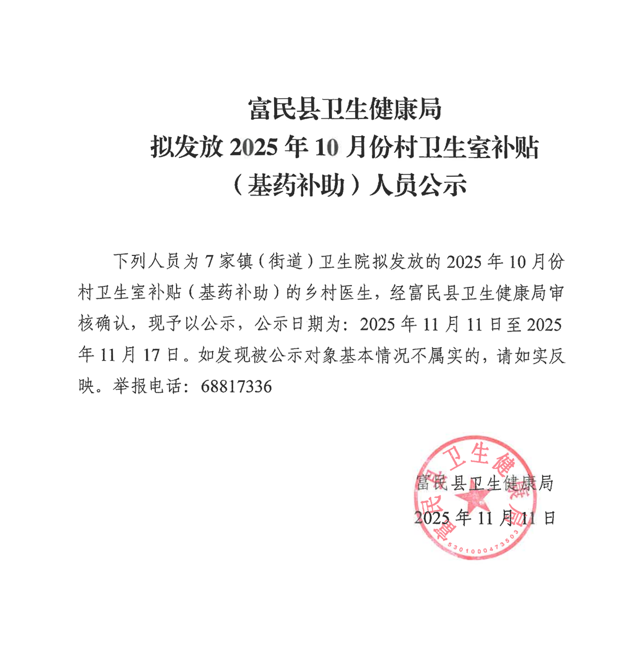 富民县卫生健康局拟发放2025年10月份村卫生室补贴(基药补助)人员名单