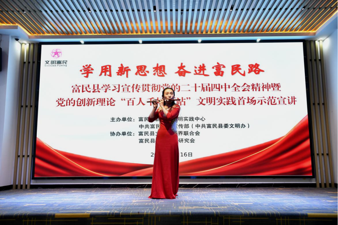 为深入学习宣传贯彻党的二十届四中全会精神,全面贯彻习近平文化思想和习近平总书记关于精神文明建设的重要指示精神,推动党的创新理论深入人心、落地生根,2026年1月16日下午,县委宣传部(文明办)联合县文联、县延安精神研究会在富民县新时代文明实践中心开展党的创新理论“百人千场进万站”文明实践首场示范宣讲活动。本次活动以“学用新思想 奋进富民路”为主题,各镇(街道)新时代文明实践所、县文联相关协会代表、县延安精神研究会以及县十佳理论宣讲员代表等共计50余人参加。
