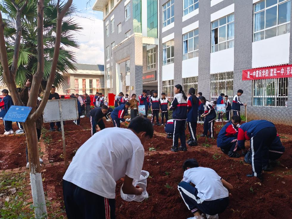 劳动教育深耕落地、融入日常,夯实五育融合根基。学校专门搭建植物种植劳动体验基地,为各班级划定专属实践片区,配备专业指导教师,组建专业教师与农技人员协同指导队伍,专业教师负责全程种植理论教学,特邀农技人员进校开展种植实操指导,引导学生全程参与种植全流程。同步丰富劳动教育载体,开设食堂餐厨实践、富民特色早餐制作等生活化劳动课程,融入劳动工具使用技巧专项教学,增设劳动模范学习特色课程,让学生在躬身劳作中体悟耕耘之苦、收获之乐,在技能习得中锤炼劳动本领,在榜样引领中厚植劳动情怀,同步梳理实践心得、规范撰写研究报告,让劳动教育真正成为锤炼意志、培育品格的重要抓手,推动劳动教育与德智体美四育同向同行、互促共进。