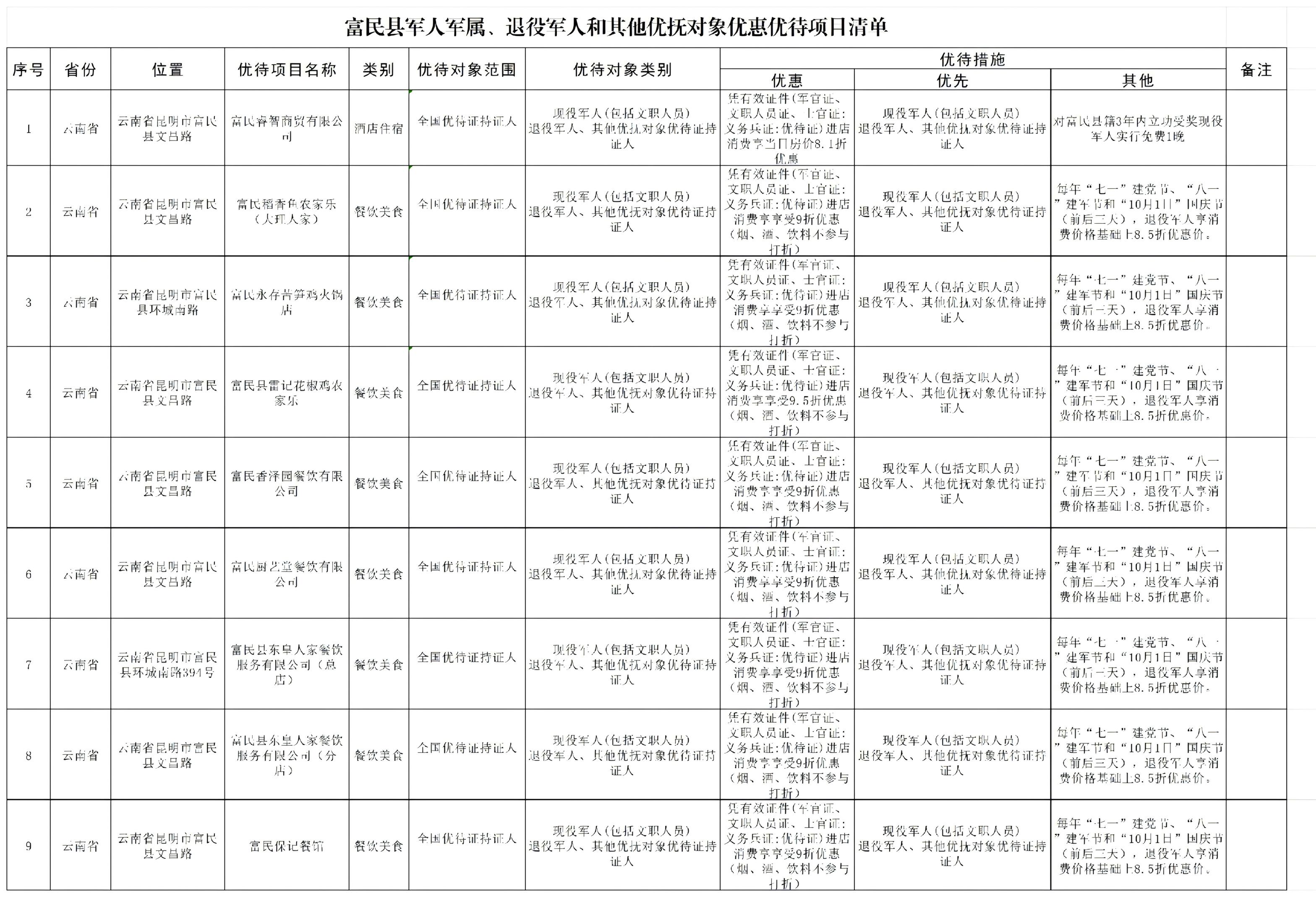 为进一步弘扬拥军优属光荣传统,推进社会化拥军和关心关爱退役军人工作,拓展优待领域,丰富优待内容,进一步提升退役军人和其他优抚对象的荣誉感、获得感、幸福感,富民县退役军人事务局广泛引入和对接社会服务资源,富民县9家优待政策予以公布,欢迎全国广大现役、退役军人和其他优抚对象持优待证前来享受更大范围、更多领域的优待福利!