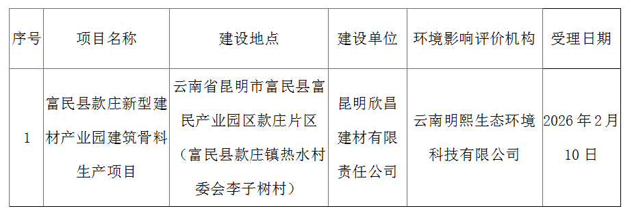昆明市生态环境局关于2026年2月10日建设项目环境影响评价文件受理情况的公示