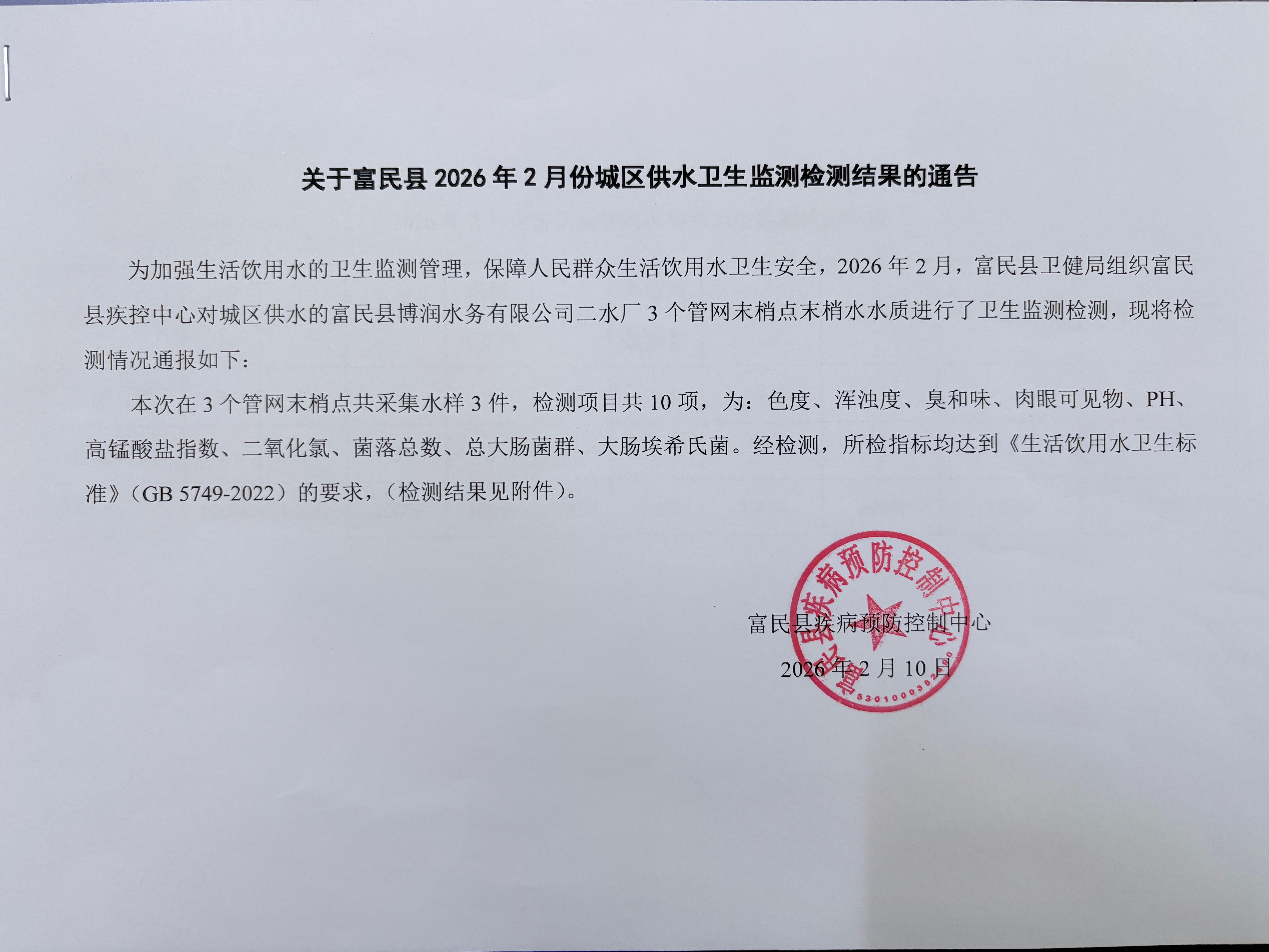 名 称: 关于富民县2026年2月份城区供水卫生监测检测结果的通告