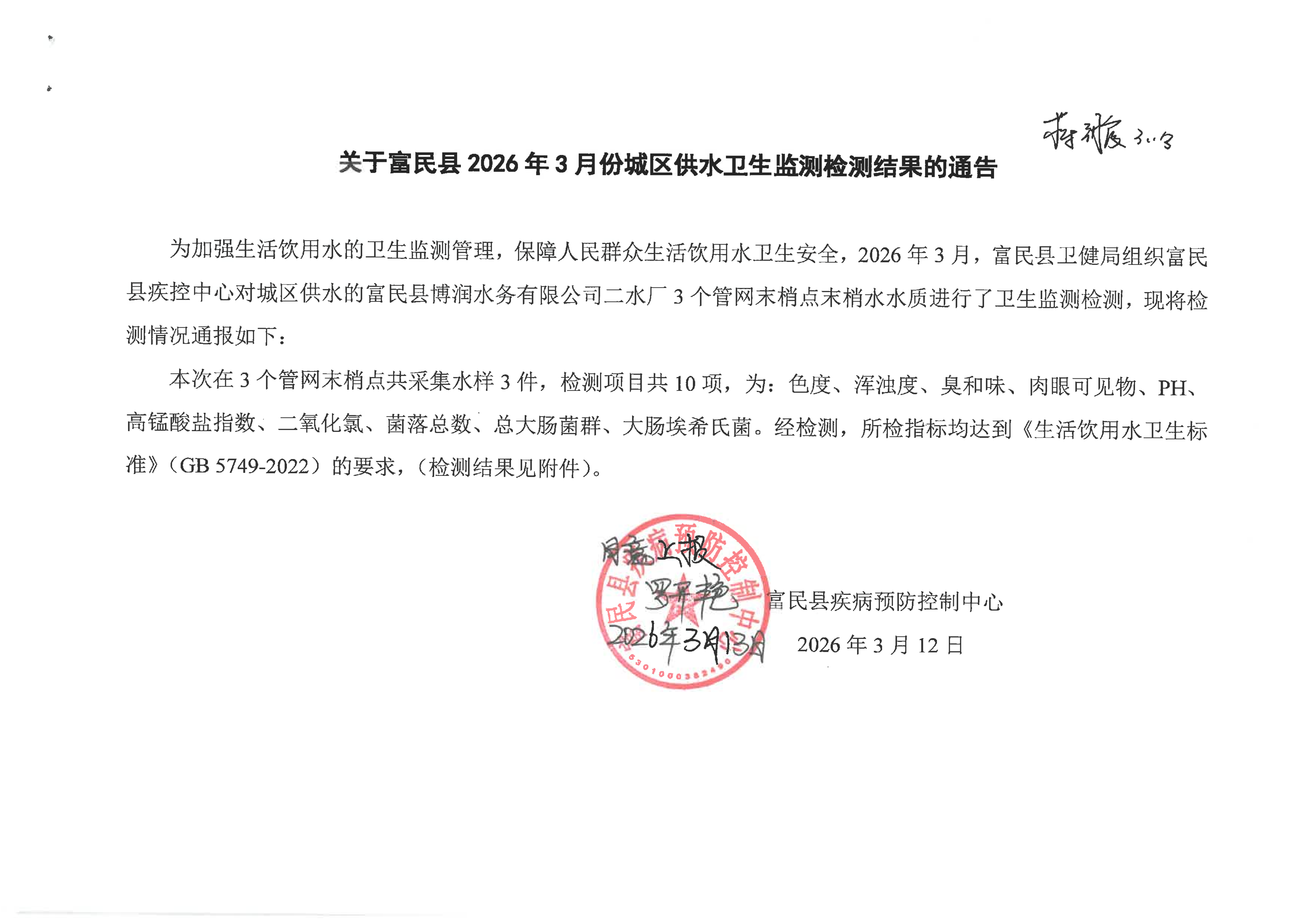 名 称: 关于富民县2026年3月份城区供水卫生监测检测结果的通告
