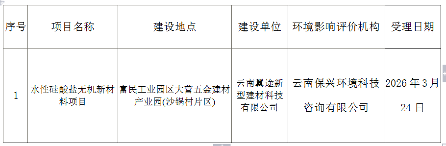 根据建设项目环境影响评价审批程序的有关规定,2026年3月24日,我局受理1个建设项目环境影响评价文件,现将受理情况予以公示,公示期为2026年3月25日—2026年3月31日(5个工作日)。